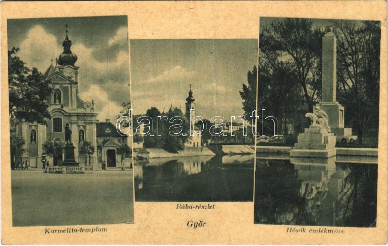 1944 Győr, Karmelita templom, Rába részlet, Hősök emlékműve (fa) https://www.darabanth.com/hu/405-Gyorsarveres/405.0/Kepeslapok/Magyarorszag~1000001/1944-Gyor-Karmelita-templom-Raba-reszlet-Hosok-emlekmuve-fa~II2450698