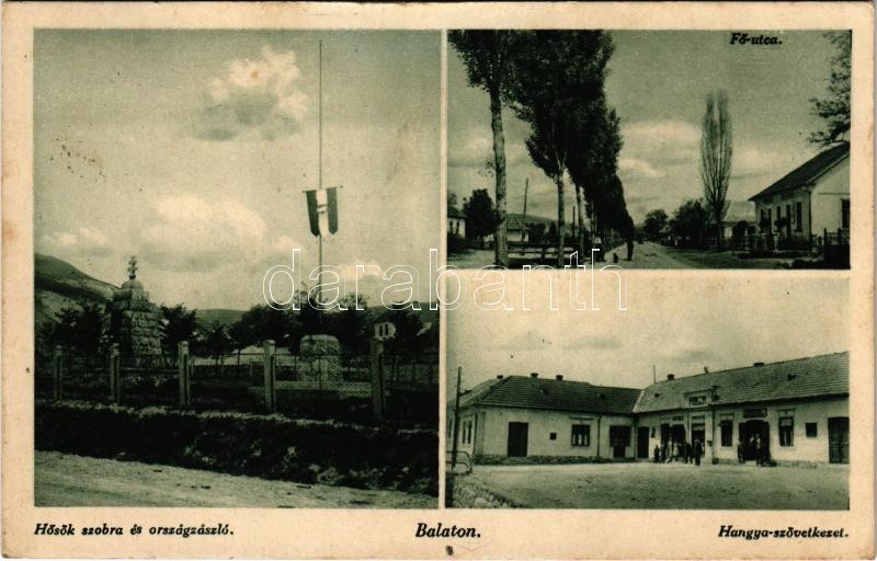 Leírás: Balaton (Heves), Hősök szobra és országzászló, Fő utca, Hangya szövetkezet üzlete és saját kiadása