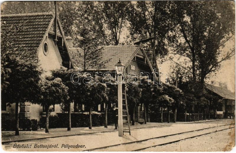 Leírás: Battonya, Battonja; pályaudvar, vasútállomás, gázlámpa létrával (EK)
