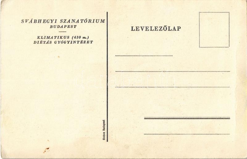 Leírás: Budapest XII. Svábhegyi Szanatórium Klimatikus Diétás Gyógyintézet reklámlapja. Globus (fa)