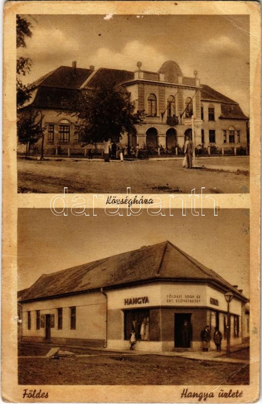 Leírás: Földes, Községháza, Hangya szövetkezet üzlete és saját kiadása (EB)