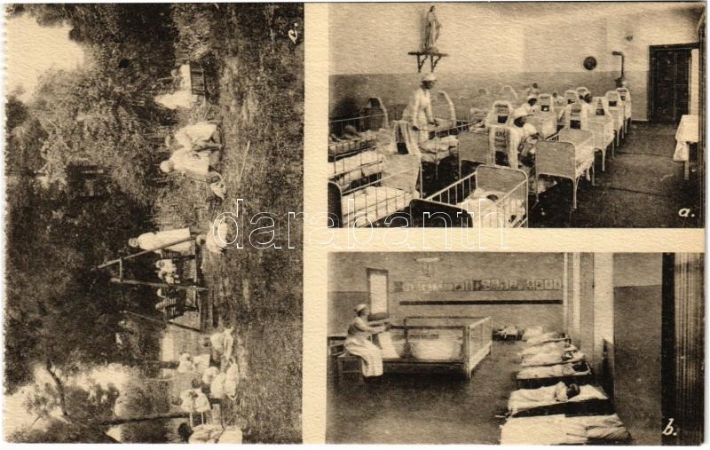 Leírás: Fót, Segítő és népjóléti bizottság napközi otthona, hálóterem, belső, ebéd utáni pihenés, kert részlet. Faragó Phot. (Újpest)