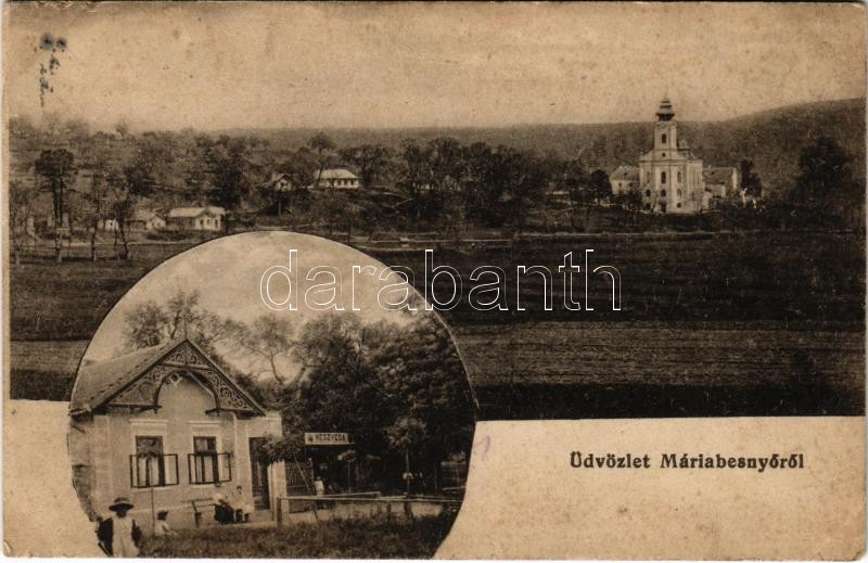 Leírás: Máriabesnyő (Gödöllő), kegytemplom, Neszveda vendéglője a "Méhkashoz" és saját kiadása (Rb)