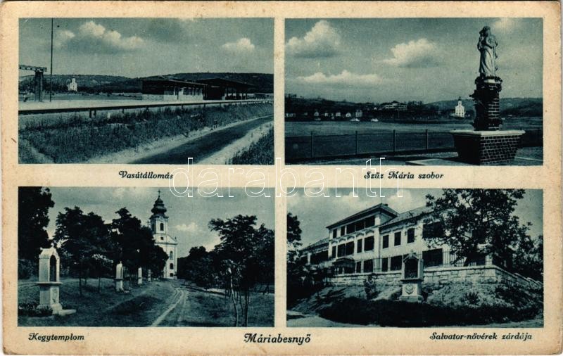 Leírás: Máriabesnyő (Gödöllő), vasútállomás, Kegytemplom, Szűz Mária szobor, Salvator nővérek zárdája (EK)