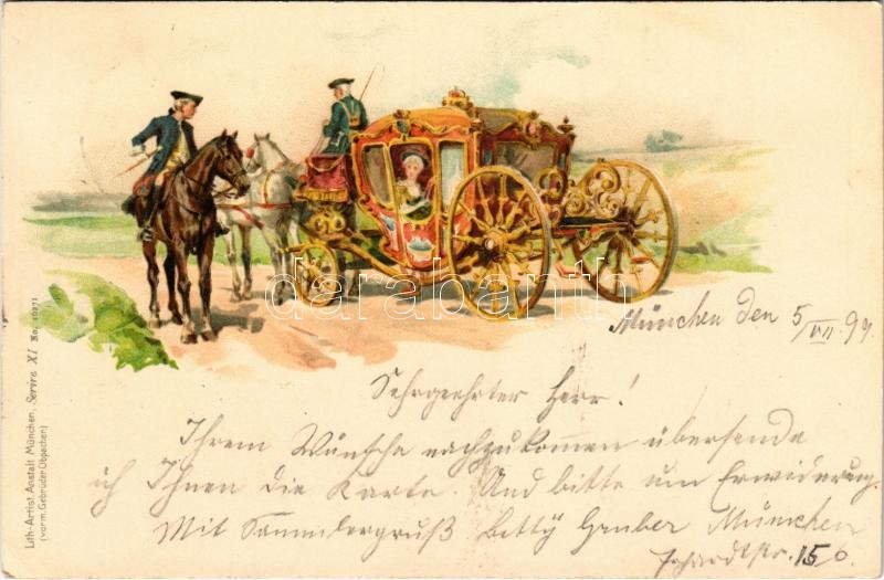 Leírás: 1899 (Vorläufer) Barokk hintó / Baroque chariot. Gebrüder Obpacher Serie XI. No. 16271. litho