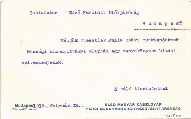 1915 Peri és Schacherer Rt. Első Magyar Kábelgyár rt. reklám / Hungari... https://www.darabanth.com/hu/405-Gyorsarveres/405.0/Kepeslapok/Reklam~1000090/1915-Peri-es-Schacherer-Rt-Elso-Magyar-Kabelgyar-rt-reklam-Hungarian-Cable-factory~II2394395