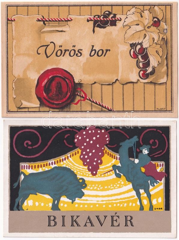 Leírás: 2 db RÉGI magyar bor reklámlap: Bikavér, vörösbor / 2 pre-1945 Hungarian wine advertisement cards (non PC)