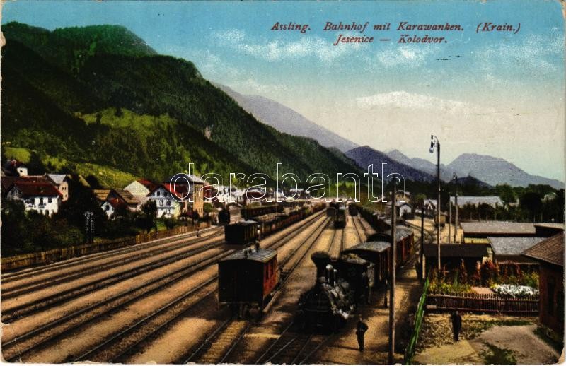1916 Jesenice, Assling, Aßling; Bahnhof / Kolodvor / railway station, ... https://www.darabanth.com/hu/405-Gyorsarveres/405.0/Kepeslapok/Szlovenia~1000056/1916-Jesenice-Assling-AC39Fling-Bahnhof-Kolodvor-railway-station-trains-locomotive-EK-plus-K~II2503821