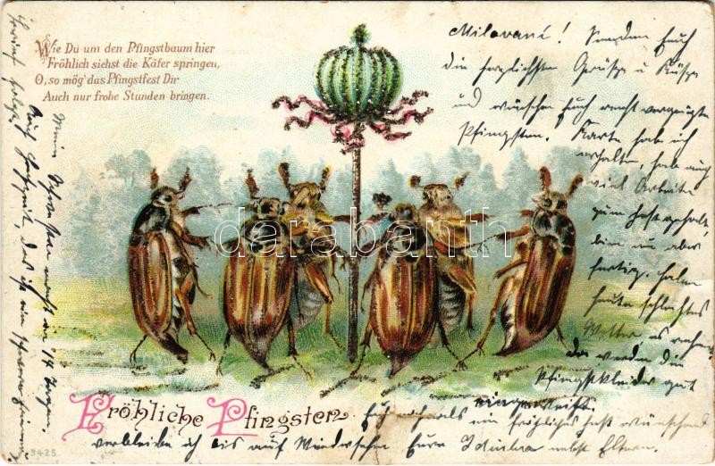 Leírás: 1901 Fröhliche Pfingsten / Pentecost with dancing may bugs. decorated litho / Pünkösdi üdvözlet táncoló cserebogarakkal, díszített litho