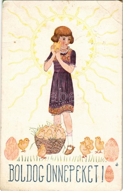 1917 Boldog Ünnepeket / Easter greeting art postcard, girl with chicke... https://www.darabanth.com/hu/405-Gyorsarveres/405.0/Kepeslapok/Udvozlolapok-Unnepek~1000099/1917-Boldog-Unnepeket-Easter-greeting-art-postcard-girl-with-chicken-EB~II2160474
