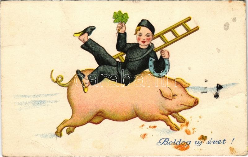 Boldog Újévet! / New Year greeting card, chimney sweeper riding on a p... https://www.darabanth.com/hu/405-Gyorsarveres/405.0/Kepeslapok/Udvozlolapok-Unnepek~1000099/Boldog-Ujevet-New-Year-greeting-card-chimney-sweeper-riding-on-a-pig-with-ladder-horseshoe-an~II2161557