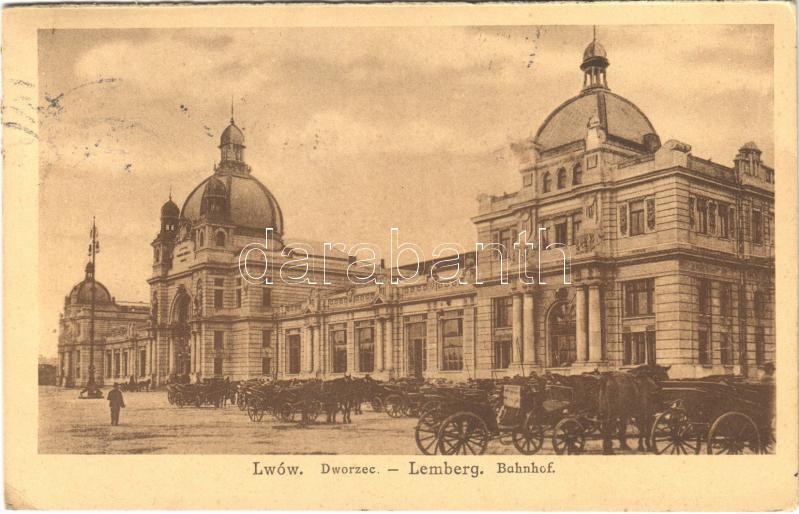 Lviv, Lwów, Lemberg; Dworzec / Bahnhof / railway station, horse-drawn ... https://www.darabanth.com/hu/405-Gyorsarveres/405.0/Kepeslapok/Ukrajna~1000060/Lviv-Lwow-Lemberg-Dworzec-Bahnhof-railway-station-horse-drawn-carriages-EK~II2450896