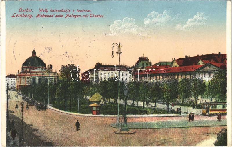 Leírás: Lviv, Lwów, Lemberg; Hermann'sche Anlagen mit Theater / theatre, tram (EK)