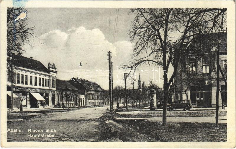 Leírás: 1941 Apatin, Fő utca, Ultmann és Török üzlete, autó / main street, shops, automobile + "1941 Apatin visszatért" So. Stpl
