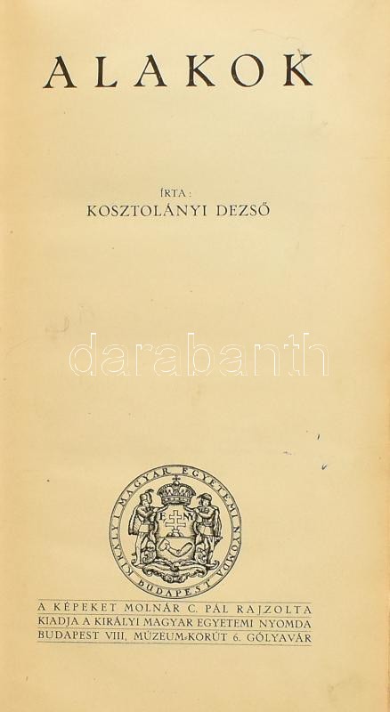 Kosztolányi Dezső: Alakok. Molnár C. Pál szövegközti illusztrációival. Bp.,[1929], Kir. M. Egyetemi Nyomda, 144+1 p. Első kiadás. Kiadói, kissé kopott egészvászon kötés