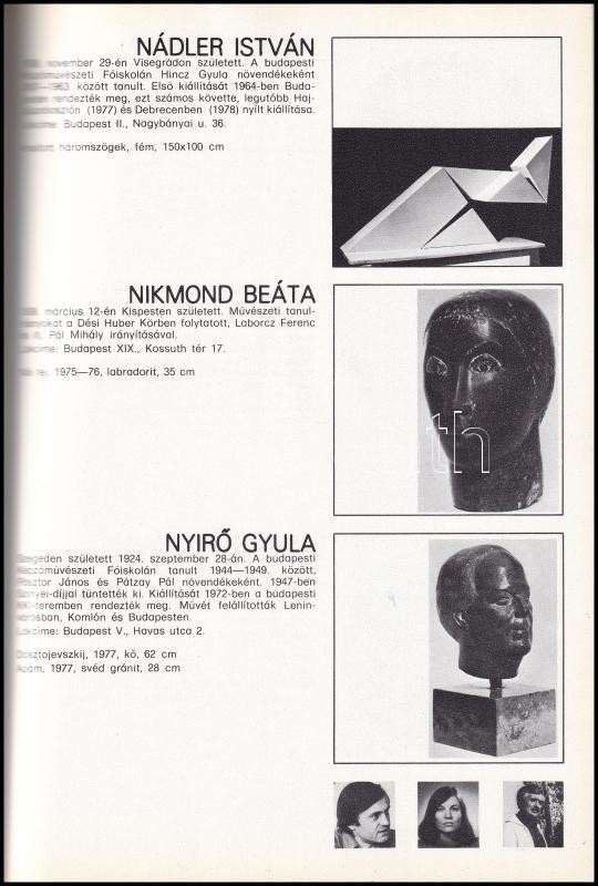 2 db magyar szobrászati kiállítási katalógus: A Magyar Képző. és Iparművészek Szövetségének kiállítása a Budapesti Történeti Múzeumban II. Szobrászat. H.n., (1981), k.n. A kiállított művekről készült 70 beragasztott diával. Kiadói papírkötés. + Kratochwill Mimi (szerk.): Magyar szobrászati kiállítás. Bp., 1978, Műcsarnok. Fekete-fehér képekkel, többe közt Borsos Miklós, Csíkszentmihályi Róbert, Kő Pál, Nádler István, Pátzay Pál, Schéner Mihály műveinek reprodukcióival illusztrált. Kiadói papírkötés.