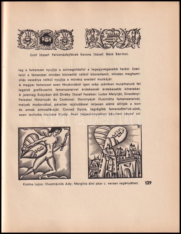 Pérely Imre (szerk.): Magyar rajzoló művészek. Bp., 1930, Könyvbarátok Szövetsége. Többek közt Scheiber Hugó, Bortnyik Sándor, Gulácsy Lajos, Kmetty János, Kozma Lajos, Molnár C. Pál illusztrációival. Több eredeti dúcról készült fametszettel (Jankó János, Kolozsváry Sándor, Kozma Lajos, Csabai Ékes Lajos, Vértes Marcell, Divéky József stb.), valamint egy-egy litográfiával (Gedő Lipót) és linómetszettel (Horváth Jenő). Kiadói aranyozott egészvászon kötésben, kissé sérült gerinccel, kopott és kissé foltos borítóval, helyenként foltos lapokkal.