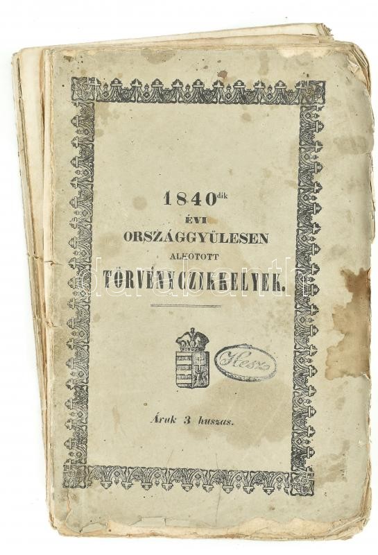 1840dik évi országgyülésen alkotott törvényczikkelyek Pozsonyban, Nyomtatták Weber, Wigand és Belnay örökösei, 2 p. + 242 p. (Folio). Articuli Comitiorum anni 1840. Kiadói, sérült papírkötésben.