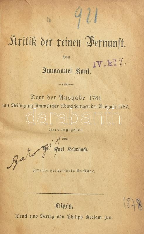 Kant, Immanuel: Kritik der reinen Vernunft. Herausgegeben von Dr. Karl Kehrbach. Zweite Auflage. Leipzig, 1878, Druck und Verlag von Philipp Reclam, XXVI+702+1 p. Német nyelven. Kopott, sérült félvászon-kötés, hiányos gerinccel, kissé laza fűzéssel, helyenként kissé sérült, foltos lapokkal.