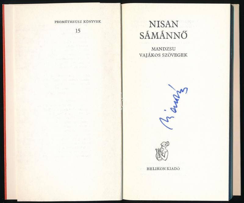 Leírás: Nisan sámánnő. Mandzsu vajákos szövegek. Vál., mandzsuból fordította, a jegyzeteket és az utószót írta: Melles Kornélia. Prométheusz Könyvek 15. Bp.,1987,Helikon. Kiadói papírkötésben. Dienes István (1929-1995) régész, muzeológus névbejegyzésével.