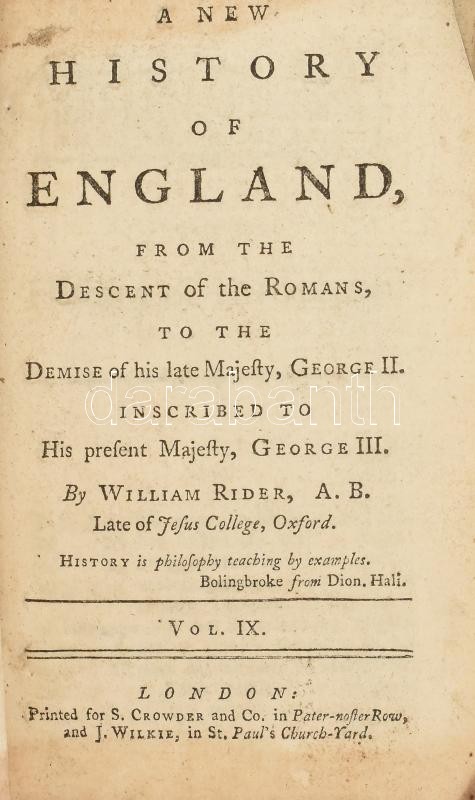 Rider, William: A new history of England, from the descent of the Romans, to the demise of his late Majesty, George II. 7 szórvány kötet a sorozatból London 1761-1763. Crowder. Vegyes állapotú korabeli egészbőr kötésben, három kötet laphiányokkal. / In mixed condition, 3 volumes with missing pages