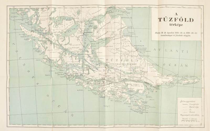 [Agostini, Alberto Maria de (1883-1960)] Alberto M. De Agostini: Tíz esztendő a Tűzföldön. Fordította: Cholnoky Béla. Magyar Földrajzi Társaság Könyvtára. Bp.,[1927.], Lampel R. (Wodianer F. és Fiai), 250+1 p.+ XVI (fekete-fehér képtáblák) t. +3 (2 kihajtható, 1 nagyméretű térkép melléklet: A Tűzföld térképe, a hajtás mentén szakadással, 37x57 cm) t. Szövegközti és egészoldalas fekete-fehér képekkel illusztrálva. Kiadói dúsan aranyozott egészvászon sorozatkötésben, a borítón apró kopásnyomokkal, jó állapotban.