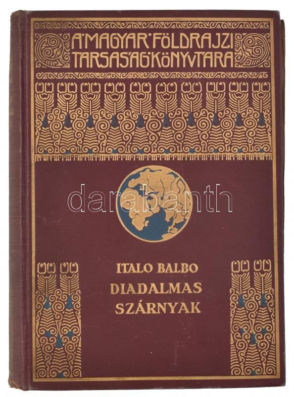 [Balbo, Italo (1896-1940)]: Italo Balbo: Diadalmas szárnyak. A második olasz óceánrepülés. Ford.: Gáspár Miklós. Magyar Földrajzi Társaság Könyvtára. Bp.,[1934.], Franklin, 256 p.+32 (fekete-fehér fotók) t.+ 2 (térkép) t. Kiadói aranyozott egészvászon sorozat-kötésben, kopott borítóval.