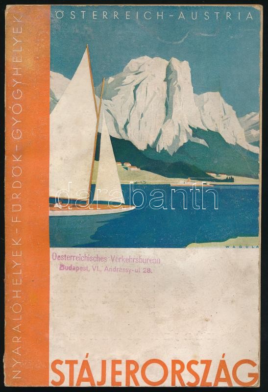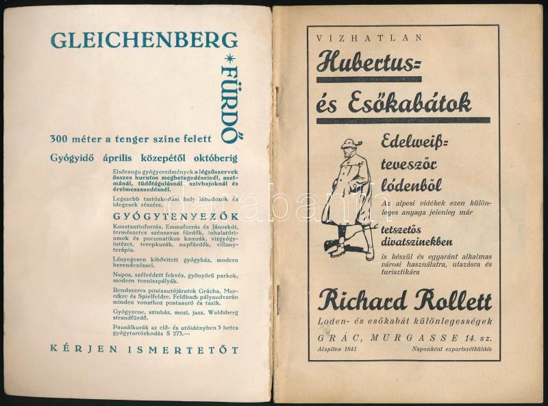 Leírás: Stájerország nyaralóhelyeinek, fürdő- és gyógyhelyeinek ismertetője. Grác, é.n. (cca 1920-1930), Stájerország Idegenforgalmi Hivatala, 128 p. Fekete-fehér fotókkal illusztrálva, korabeli hirdetésekkel. Kiadói papírkötés, sérült gerinccel, kissé sérült, foltos borítóval.