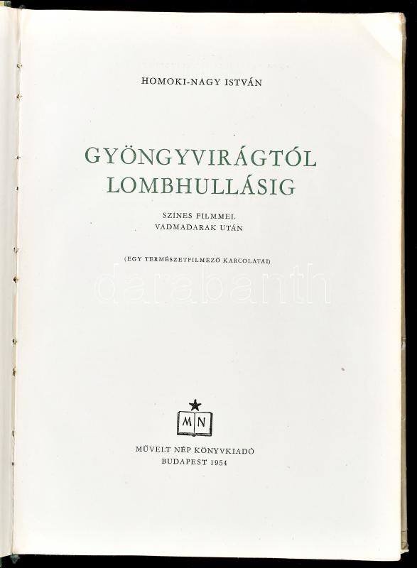 Leírás: Homoki-Nagy István: Gyöngyvirágtól lombhullásig. Bp., 1954, Művelt Nép Könyvkiadó. Félvászon kötés, sérült papír védőborítóval, sarkán nyomódott kötéstáblával, kissé kopottas állapotban.
