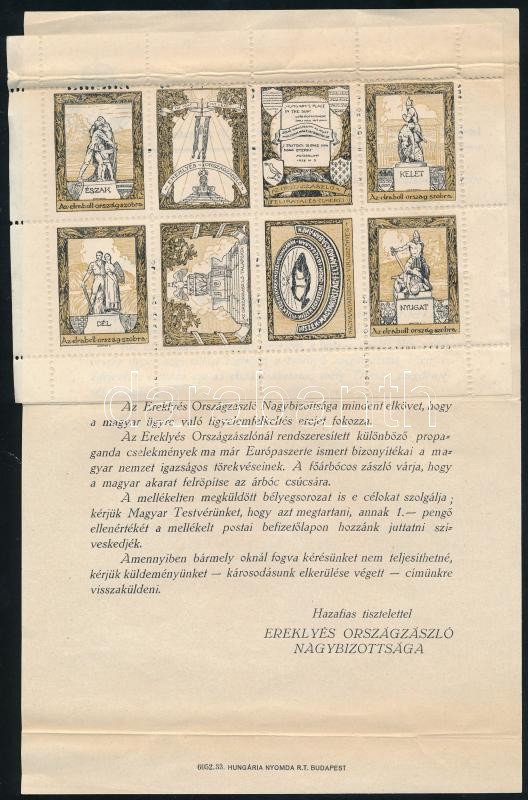 Leírás: Ereklyés Országzászló Nagybizottság adománygyűjtő levele ráragasztott irredenta levélzáró kisívvel