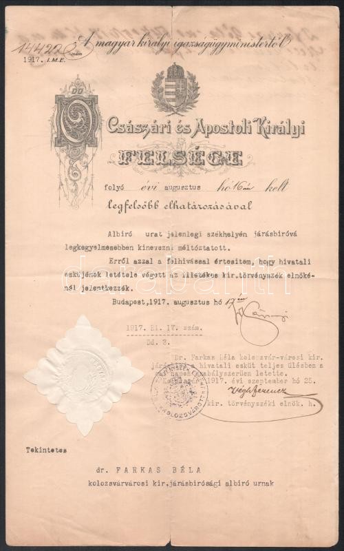 Leírás: 1917 Vázsonyi Vilmos (1868-1926) ügyvéd, miniszter saját kézzel aláírt kinevező okirata