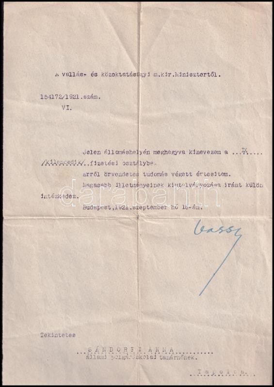 Leírás: 1921 Vass József (1877-1930) kalocsai nagyprépost,a Bethlen-kormány népjóléti és munkaügyi miniszterének aláírása kinevező okmányon
