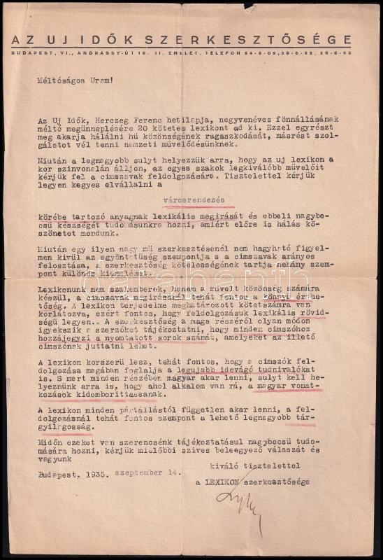 Leírás: 1935 Lyka Károly (1869-1965) művészettörténész, festő aláírása gépelt levélen