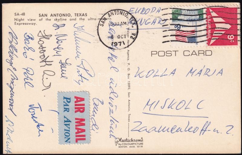 1971 San Antonio, a magyar öttusa válogatott tagjai által képeslap a világbajnokságról, rajta, Dr. Nagy Imre (1933-2013) edző (korábbi öttusázó), Balczó András (1938-, "Bandi'.), Bakó Pál (1946-), Kelemen Péter (1946-), Horváth László (1946-), Villányi Zsigmond (1950-1995) és mások aláírásaival.
