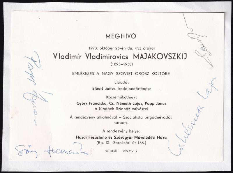 Leírás: Meghívó Papp János, Cs. Németh Lajos, Győri Franciska, Elbert János aláírásával