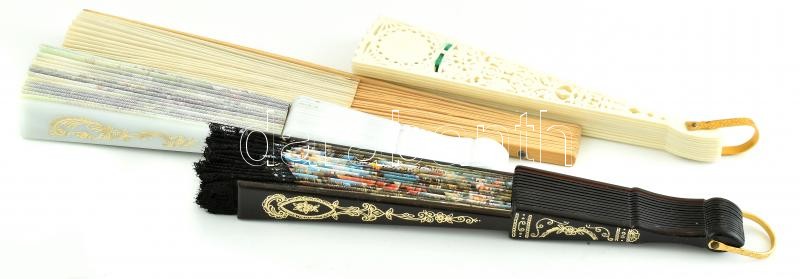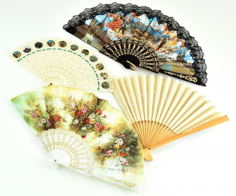 Leírás: 4 db különféle legyező, műanyag, fa, vászon, 31,5x18 cm és 46x24 cm közötti méret