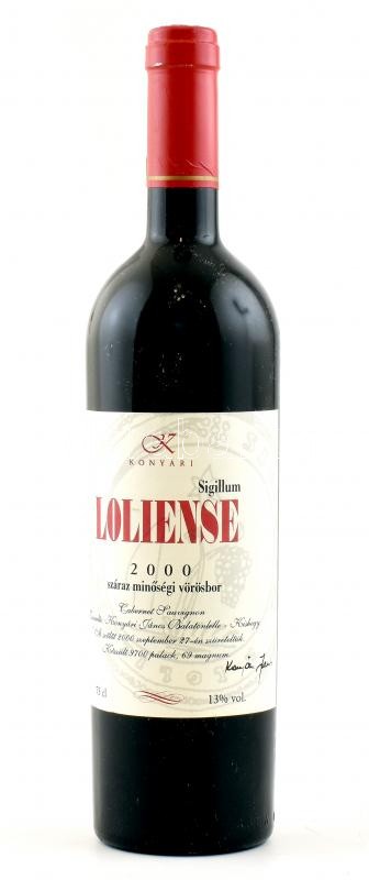 Leírás: 2000 Konyári Loliense. Bontatlan palack száraz vörösbor, szakszerűen tárolt. 13%Vol., 0,75 l.