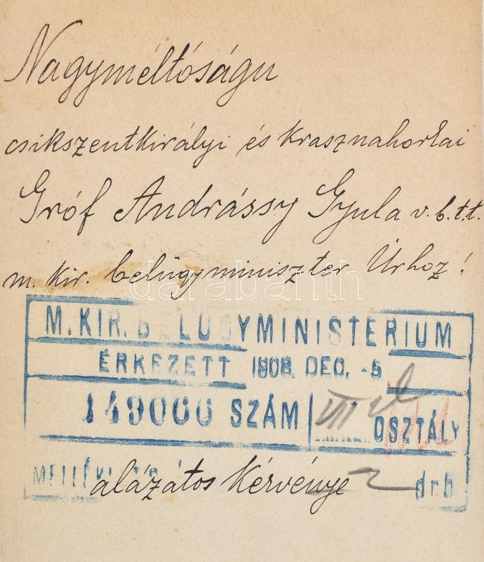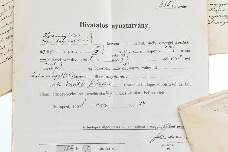 cca 1908-1909 Dr. Máthé Sándor M. kir. Tudományegyetem könyvtárőrének lipótmezei elmegyógyintézetben történt kezelésével kapcsolatos dokumentumok, levelek, stb., 10 db