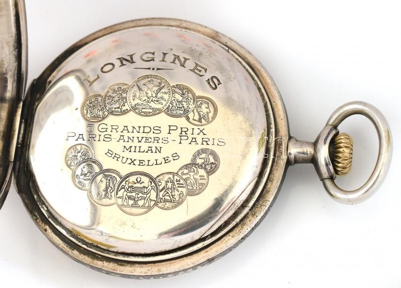 Longines niellós, aranyozott ezüst női alakokkal és tigrissel díszített dupla ezüst fedeles zsebóra. Sérült számlap, szép állapot, jelzett szerkezet és tok (egyező sorszám 2727606) nem jár. d: 50 mm