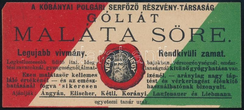 cca 1920-1930 Kőbányai Polgári Serfőző Rt. Góliát malátasör italcímke,... https://www.darabanth.com/hu/405-Gyorsarveres/405.0/Mutargy-papirregiseg-egyeb/Reklam~22/cca-1920-1930-Kobanyai-Polgari-Serfozo-Rt-Goliat-malatasor-italcimke-10x4-cm~II2504186