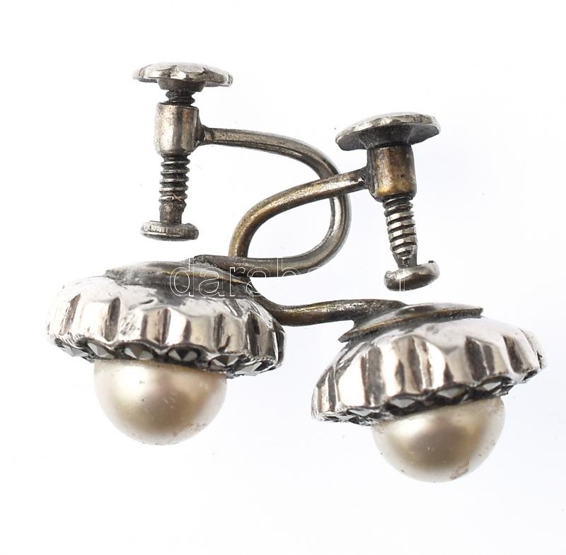 Leírás: Gyönggyel és markazittal díszített fülbevalópár, ezüst(Ag) foglalattal, fém tartórésszel, jelzés nélkül, bruttó: 7,52 g