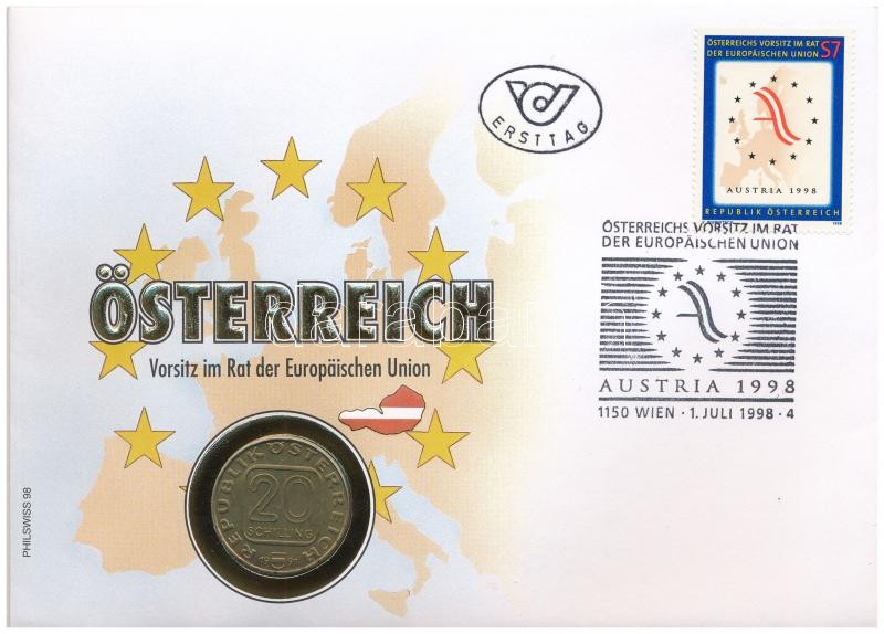 Ausztria 1991. 20Sch Al-Ni-Br "Franz Grillparzer", "Ausztria az Európai Unió Tanácsának elnöke" érmés borÃtékban, elsÅ‘napi bélyegzéses bélyeggel, német nyelvű leÃrással T:2 Austria 1991. 20 Schilling Al-Ni-Br "Franz Grillparzer" in Austria - Presidency of the Council of the European Union" coin envelope with first day of issue stamp, with German description C:XF