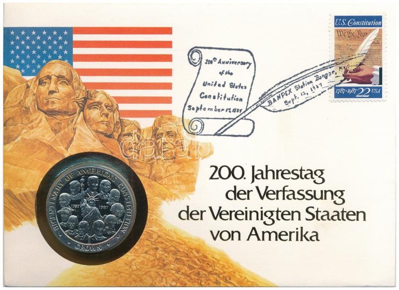 Man-sziget 1987. 1C Cu-Ni "200 éves az Egyesült Államok Alkotmánya" érmés borítékban, bélyeggel, bélyegzéssel T:PP Isle of Man 1987. 1 Crown Cu-Ni "Bicentenary of America's Constitution" in envelope with stamp and cancellation C:PP Krause KM#127