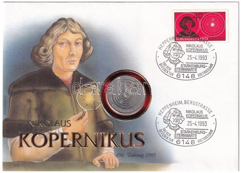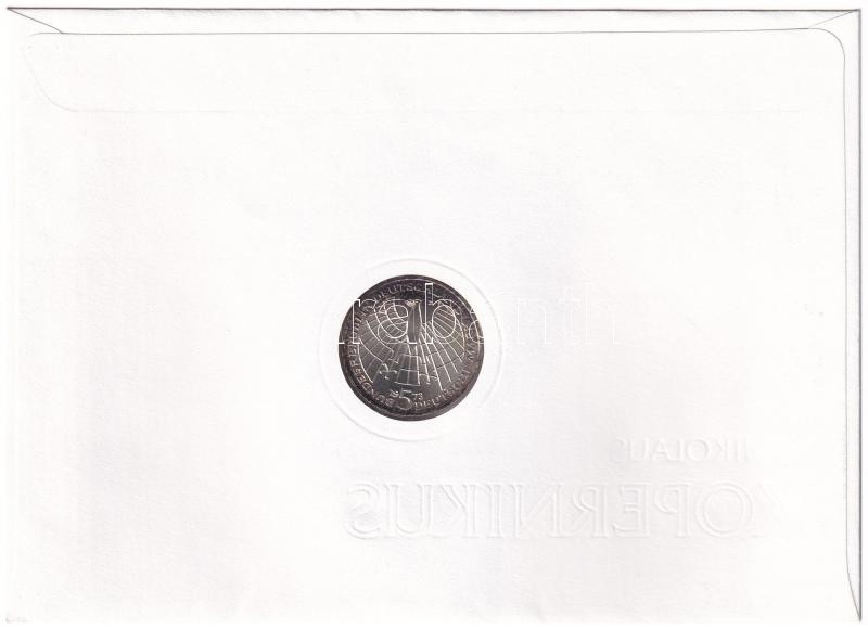 Német Szövetségi Köztársaság 1973J 5M Ag "Kopernikusz" érmés borítékban, bélyegzéses bélyeggel, német nyelvű leírással T:1- patina Federal Republic of Germany1973J 5 Mark Ag "Birth of Nicholas Copernicus" in coin envelope with stamp and cancellation, with German information C:AU patina Krause KM#136