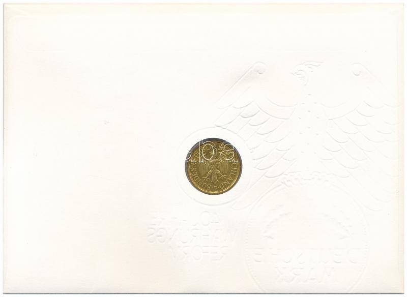 Német Szövetségi Köztársaság 1988D 1M Cu-Ni aranyozva, "40 éves a valutareform" érmés borítékban, bélyeggel, bélyegzéssel, német nyelvű leírással T:1- FRG 1988D 1 Mark Cu-Ni gilt, in "40 Years of Currency Reform" coin envelope with stamp and cancellation, with German description C:AU