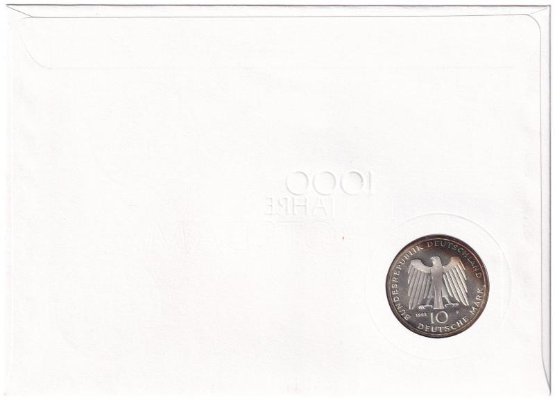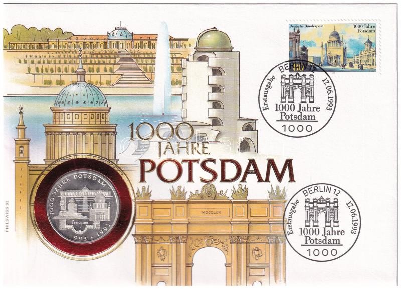 Németország 1993F 10M Ag "1000 éves Potsdam" érmés borítékban, elsőnapi bélyegzéses bélyeggel, német nyelvű leírással T:PP patina Germany 1993F 10 Mark Ag "1000th Anniversary - Potsdam" in coin envelope with first day of issue stamp, with German information C:PP patina Krause KM#180
