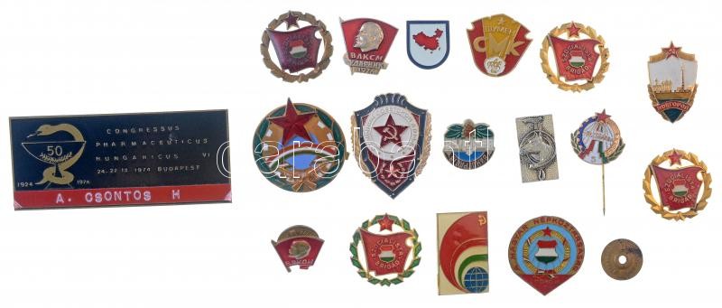 17db vegyes magyar és külföldi szocialista kitüntetés, jelvény, közte 1974. "Congressus Pharmaceuticus Hungaricus VI 24-27 IX 1974 Budapest (Magyar Gyógyszerész Kongresszus 1974.IX.24-27." zománcfestett fém névtábla (36x80mm) T:2,2-
