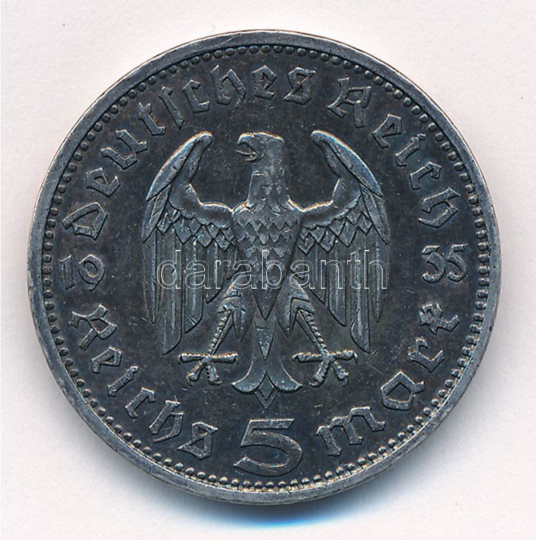 Német Harmadik Birodalom 1935E 5M Ag "Hindenburg" T:2 patina... https://www.darabanth.com/hu/405-Gyorsarveres/405.0/Numizmatika/Kulfoldi-fem-es-ezustpenzek~1500014/Nemet-Harmadik-Birodalom-1935E-5M-Ag-Hindenburg-T2-patina--German-Third-Reich-1935E-5-Marks-Ag-~II2498325