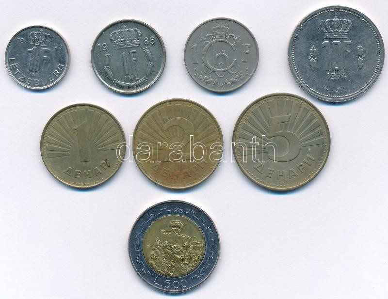 Leírás: Vegyes: Luxemburg 1964-1990. 1Fr (3xklf) + 1974. 10Fr + Macedonia 1993. 1D + 2D + 5D + San Marino 1988. 500L T:1-,2