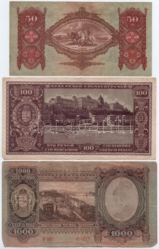 1932. 50P + 1943. 1000P + 1945. 100P T:III,III- Adamo P14, P21, P18, https://www.darabanth.com/hu/405-Gyorsarveres/405.0/Numizmatika/Magyar-bankjegyek~1500007/1932-50P-plus-1943-1000P-plus-1945-100P-TIII-III-Adamo-P14-P21-P18-~II2502068